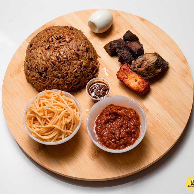 Partez pour une aventure gustative avec le riz togolais Ayimolou accompagné d'une sélection de bœuf, poisson, œuf ou Wangash. Servi avec des fritures de tomate, macaroni ou galifɔto