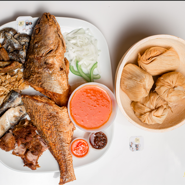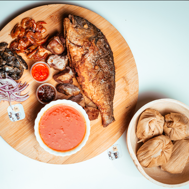 Embarquez pour un périple culinaire avec un chinchard entier, servi avec 3 boules de Khom, croupion de dinde, et une sauce tomate relevée. Chaque bouchée vous transporte aux côtes ouest-africaine.